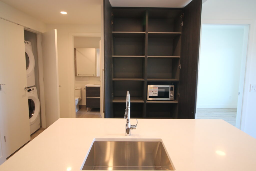 Kitchen features a natural Gas stove, pull out extractor hood, Microwave in main storage cupboard, Fridge/Freezer, Island Sink and loads of storage. Full Size tub off the main bedroom just past the walk-through closet, with a jack & jill entrance from the main entry area as well. The suite also come with a near full size 2 piece stacked Washer and Dryer in the main Closet