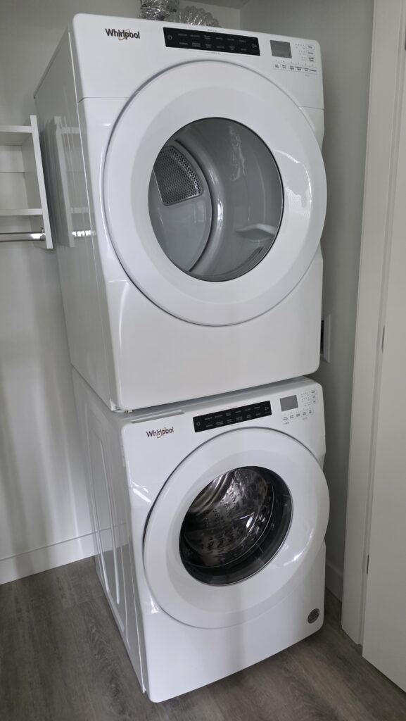 Kitchen features a natural Gas stove, pull out extractor hood, Microwave in main storage cupboard, Fridge/Freezer, Island Sink and loads of storage. Full Size tub off the main bedroom just past the walk-through closet, with a jack & jill entrance from the main entry area as well. The suite also come with a near full size 2 piece stacked Washer and Dryer in the main Closet